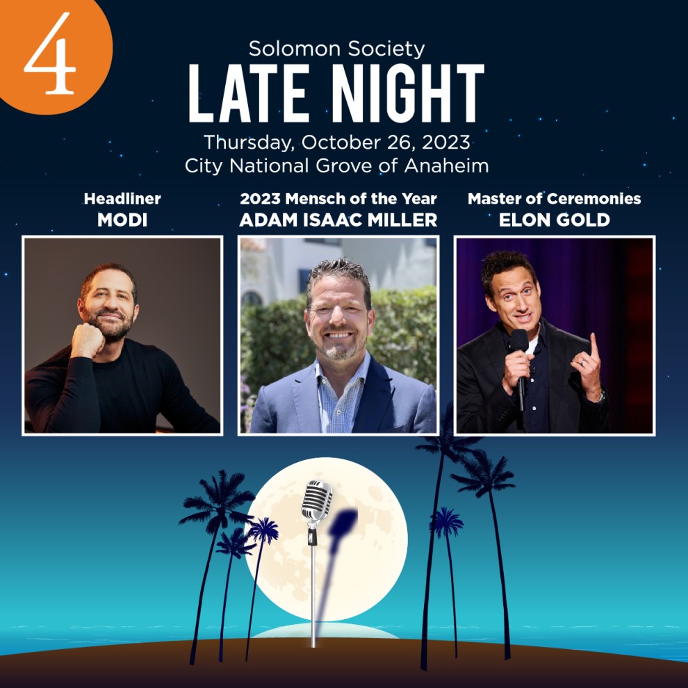 Join us on Thursday, October 26, for the 14th annual LATE NIGHT with Solomon Society, the signature event for men sponsored by Jewish Federation of Orange County. Late Night with Solomon Society raises critically needed funds to support Federation's work in Orange County, Israel, and worldwide. We will honor our 2023 Mensch of the Year, Adam Isaac Miller, and feature headliner comedian MODI at this year's event.