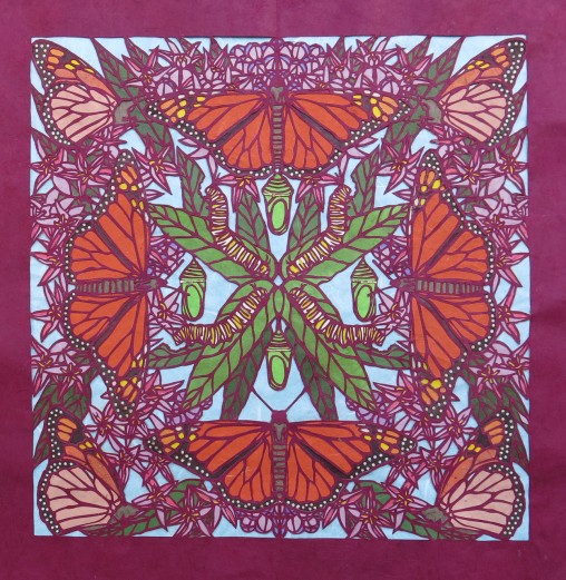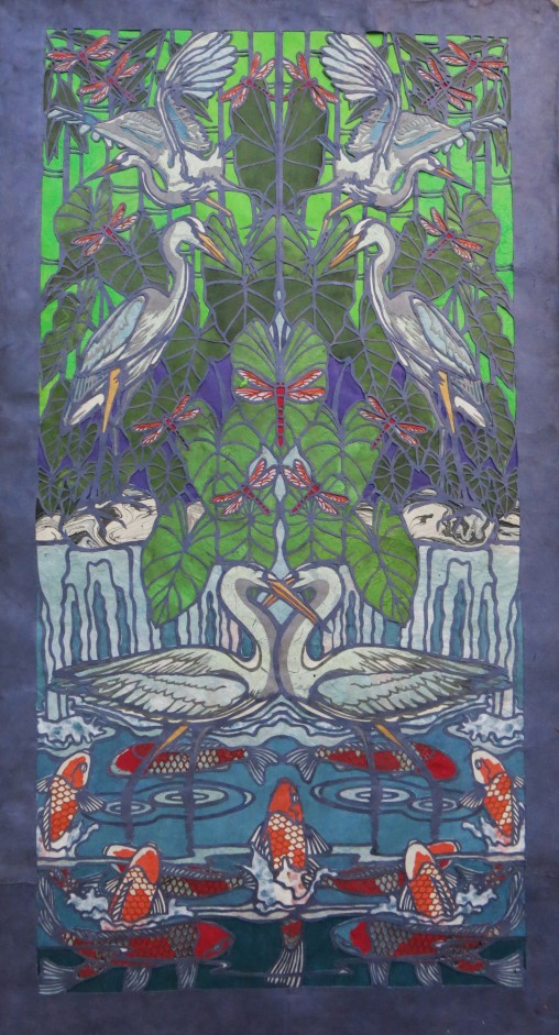 Lorraine became interested in papercutting when she realized that so many cultures around the world, ranging from Eastern Europe and China to Mexico, utilize some form of papercutting. As a world traveler, she has always been fascinated with what art forms or “folk art” local artisans create. Papercuts have been created as calendars, to mark births and deaths such as for Day of the Dead, and in Judaic tradition they hung in homes and in synagogues to decorate for holidays. Her papercutting connects her to this extensive cultural heritage, as well as actually utilizing papers created in Asian countries that she has traveled in. Papercutting is an art form that crosses the boundaries of culture, art, and craft. Lorraine turned in her paintbrush for an x-acto knife and the papercuts are kaleidoscopes of bold color, texture, and depth. Her papercuts reflect the hierarchy of nature, capturing the flora and fauna in diverse ecosystems, including in numerous National Parks where she has been the Artist in Residence. Other scenes illustrate the chaos of urban landscapes, including construction and freeway interchanges. She has exhibited her papercuts in numerous exhibits including in Germany, China, Lithuania, and Switzerland. Cutting with an x-acto knife, Lorraine creates images composed of layers of paper and layers of meaning.