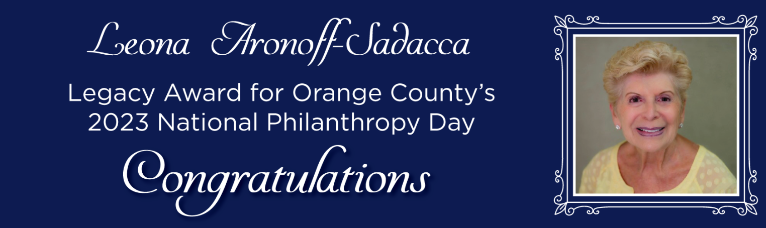 Congratulations, Leona Aronoff-Sadacca, on being named Outstanding Honoree: Legacy Award for Orange County's 2023 National Philanthropy Day (NPD)! We look forward to celebrating Leona at this year's event, Thursday, November 16, at the City National Grove of Anaheim.